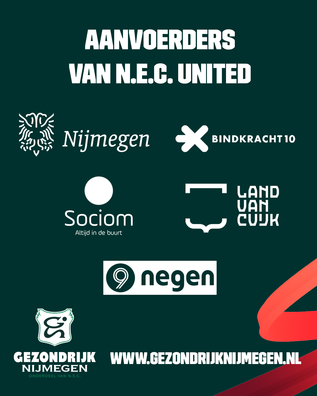 GezondRijk Nijmegen, Bindkracht10 en de gemeente Nijmegen zijn in mei 2018 gestart met de eerste editie van het maatschappelijke project N.E.C. United. Dit project richt zich op talentontwikkeling van jongeren en leerlingen uit groep 7 en 8, uit Nijmeegse wijken Lindenholt, West en Noord. Ondertussen hebben we de wijk Boxmeer Noord aan het lijstje toegevoegd, waarbij we de samenwerking met de gemeente Land van Cuijk, Negen en Sociom zijn aangegaan.